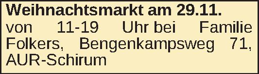 Weihnachtsmarkt am 29.11. von 11-19 Uhr bei Familie Folkers, Bengenkampsweg 71, AUR-Schirum