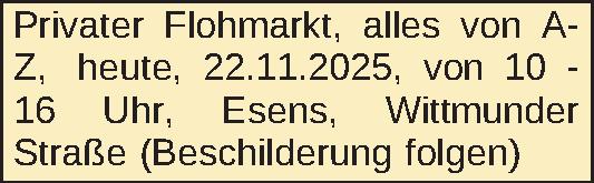 Privater Flohmarkt, alles von AZ, heute, 22.11.2025, von 10 16 Uhr, Esens, Wittmunder Straße (Beschilderung folgen)