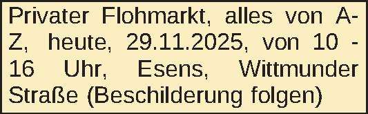 Privater Flohmarkt, alles von AZ, heute, 29.11.2025, von 10 16 Uhr, Esens, Wittmunder Straße (Beschilderung folgen)Kontakt