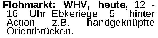 Flohmarkt: WHV, heute, 12 16 Uhr Ebkeriege 5 hinter Action z.B. handgeknüpfte Orientbrücken.Kontakt
