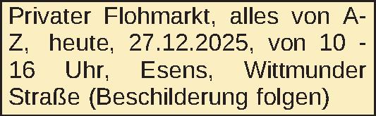 Privater Flohmarkt, alles von AZ, heute, 27.12.2025, von 10 16 Uhr, Esens, Wittmunder Straße (Beschilderung folgen)Kontakt