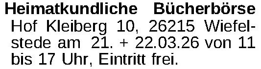 Heimatkundliche Bücherbörse Hof Kleiberg 10, 26215 Wiefelstede am 21. + 22.03.26 von 11 bis 17 Uhr, Eintritt frei.