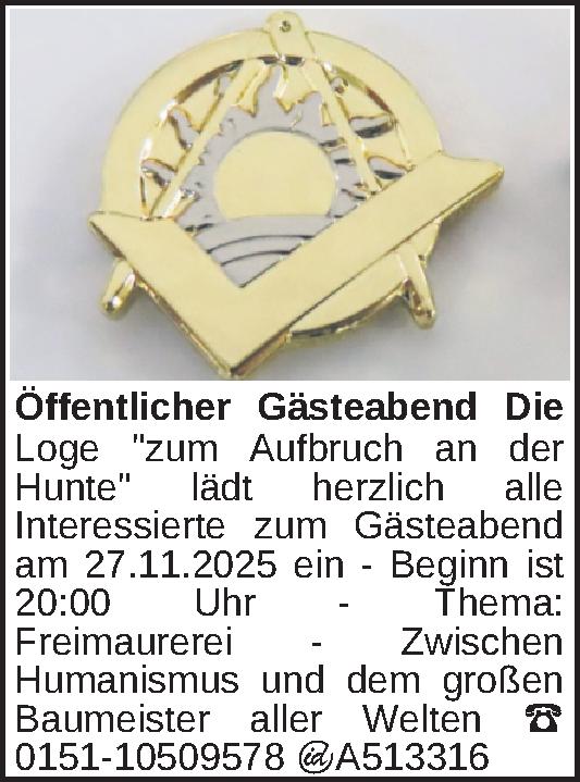 Die Loge "zum Aufbruch an der Hunte" lädt herzlich alle Interessierte zum Gästeabend am 27.11.2025 ein - Beginn ist 20:00 Uhr - Thema: Freimaurerei - Zwischen Humanismus und dem großen Baumeister aller WeltenKontakt